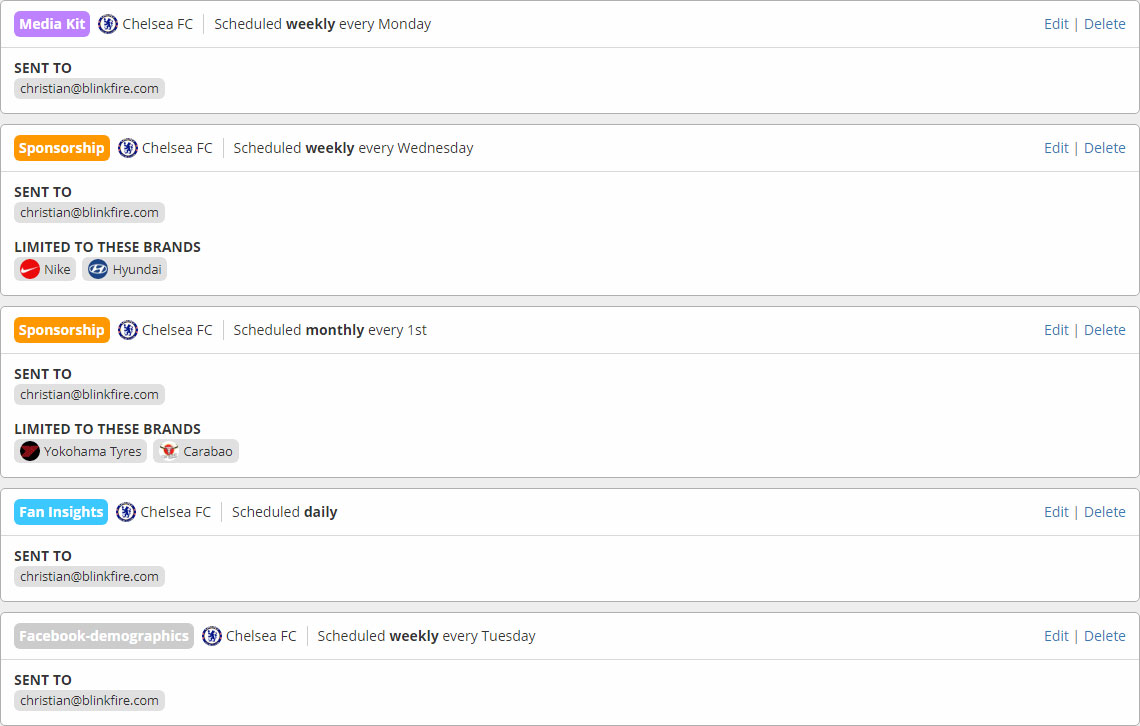 Track and manage all your scheduled reports in one place with Blinkfire’s Report Center. Schedule unlimited reports unlimited reports in PDF, XLSX, or PPTX to anyone you’d like -- from your greater team to brand partners.